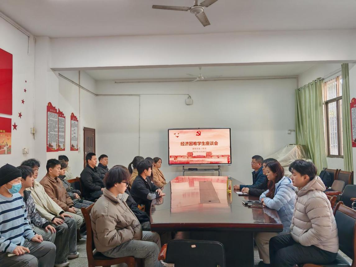 2025年12月26日,建筑设备工程系在108会议室组织召开经济困难学生座谈会。系党总支副书记邬文武、系学工办主任李石佳、辅导员曹依婷以及部分经济困难学生代表。